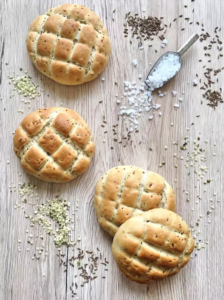 Свежий домашний хлеб-это у нас основа хорошего настроения 🙂 Кто не любит запах свежайшего хлеба, который раздается из духовки по всей кухне, и это замечательное чувство, когда кусаете хрустящую корочку у свежей выпечки? Я люблю пробовать новые сочетания, формы, а в тесто добавляю также различные семена и травы, и сегодня у меня для вас рецепт пшенично – ржаных лепешек с чесноком! Ингредиенты (на 10 шт): Для опары(дрожжевая смесь): 10 г теплой воды 15 г свежих дрожжей 1 столовая ложка пшеничной муки Для теста: 200 г ржаной муки 300 г пшеничной муки 200 г теплой воды 50 г сливок 60 г топленого сала 2 зубчика чеснока(измельчить) 2 столовые ложки кунжута (можно добавить и другие семена, в соответствии со своими предпочтениями) 2 чайной ложки соли Сначала из указанных ингредиентов приготовьте дрожжевую смесь. В миске кухонного комбайна все смешать и пусть некоторое время отдохнуть в теплом месте. В другой миске вы тем временем подготовьте все ингредиенты на тесто и добавить готову