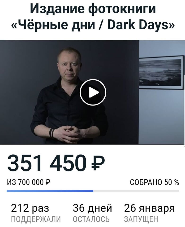 Друзья, мы с вами собрали 50% суммы, необходимой для издания книга Валерия Мельникова «Чёрные дни / Dark Days». Несмотря на коронавирус, мировой экономический кризис и мигрень нашего модератора. 50% — гарантия того, что книга обязательно выйдет! В то же время, 350 тысяч рублей — лишь половина необходимой суммы. Ведь «Чёрные дни / Dark Days» будут изданы небольшим тиражом в высококачественном полиграфическом исполнении. Это книга-напоминание, книга-предостережение и одновременно ценный арт-объект. «Чёрные дни / Dark Days» — абсолютно гуманистический, не коммерческий проект. Все собранные средства пойдут на оплату услуг типографии. Помогите нам репостами и приобретением лотов на краудфандинговой платформе Planeta. Лоты разные, в том числе непосредственно «Чёрные дни / Dark Days», книга-зин «You’ve got to take this moment», открытка с фотографией из издания, майки и сумки с логотипом проекта Underground, портфолио-ревю и мастер-класс Валерия Мельникова, шикарно оформленные постеры с уника