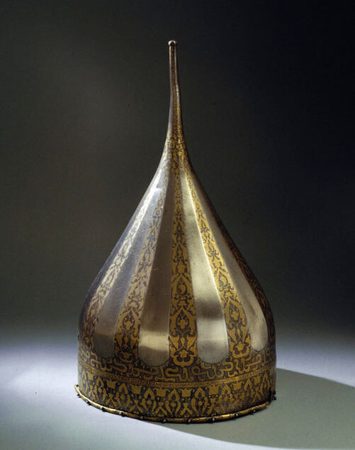 Аналогичная ситуация возникает и с зерцальными доспехами, и со знаменитыми «шапками иерихонскими» - парадными шлемами русских царей. Половина «шапок иерихонских», являющихся важной частью торжественного воинского наряда русского царя, имеет религиозные арабские надписи. Поразительно, что другие языки, кроме арабского, при этом не используются.