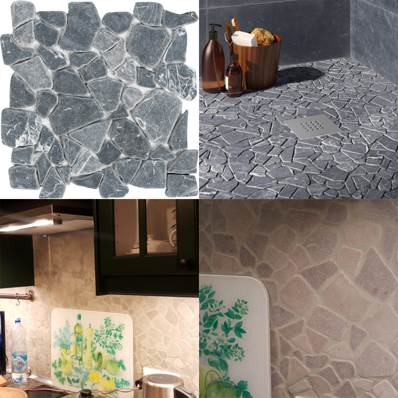 Все уже давно привыкли к мозаике из стекла или керамики, которую можно купить в любом строительном магазине. Но не так давно в магазинах появился новый материал — мозаика из натурального камня. Она также продается готовыми листами на сетке, но в отличие от стеклянной или керамической мозаики имеет совсем другую форму. Форму натуральных камней. Материалом служат самые разные виды камней, самые распространенные это мрамор и галька. Применять такую мозаику можно для декорирования стен, а также укладывать на пол (производитель предлагает такой вид отделки для пола душевой кабины). Но мы бы не советовали использовать этот материал на полу, так как для качественной укладки нужно использовать эпоксидную затирку, а с такими зазорами между камнями вы на ней разоритесь. Да и очищать такую поверхность довольно сложно, что для пола очень важно. В то же время использовать такой камень для фартука — отличная находка для прованского стиля вашей кухни. При выборе камня заранее подберите подходящий ц