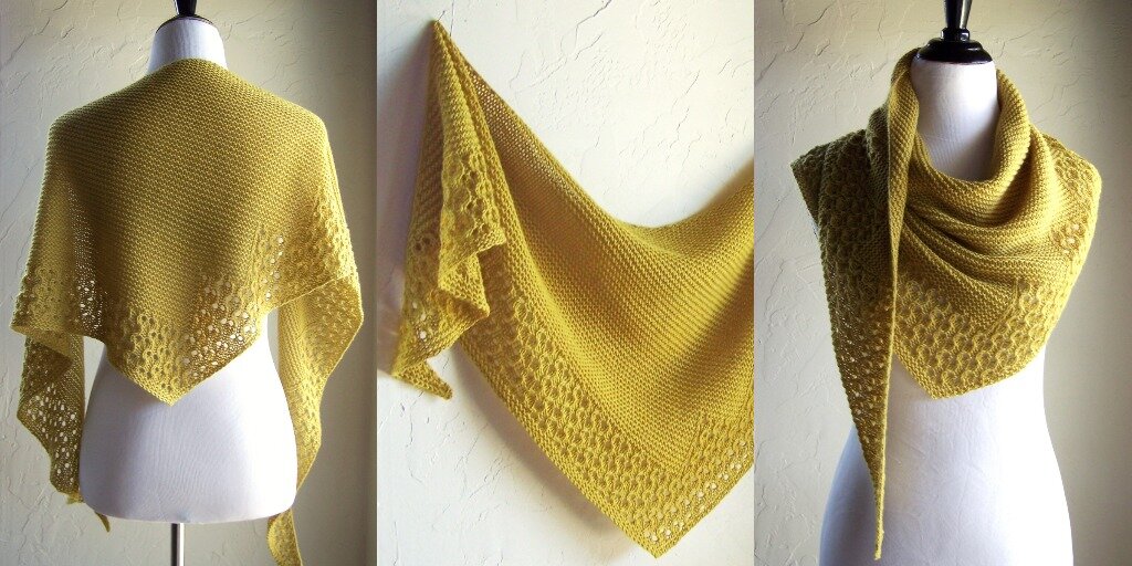 Вязаная спицами, треугольная, асимметричная, слегка изогнутая по верхнему краю шаль. Описание для треугольной, асимметричной шали, слегка изогнутой по верхнему краю. Она вяжется сбоку, начиная с правого конца, и формируется путем прибавок одной петли в конце каждого ряда с изнаночной стороны (верхний край). Вяжется быстро и просто, потому как основной узор шали - это платочная вязка. Для ажурного узора по краю в описании приведены схемы и порядное описание. Пошаговое, порядное описание приведено для вязания всей шали. Описание