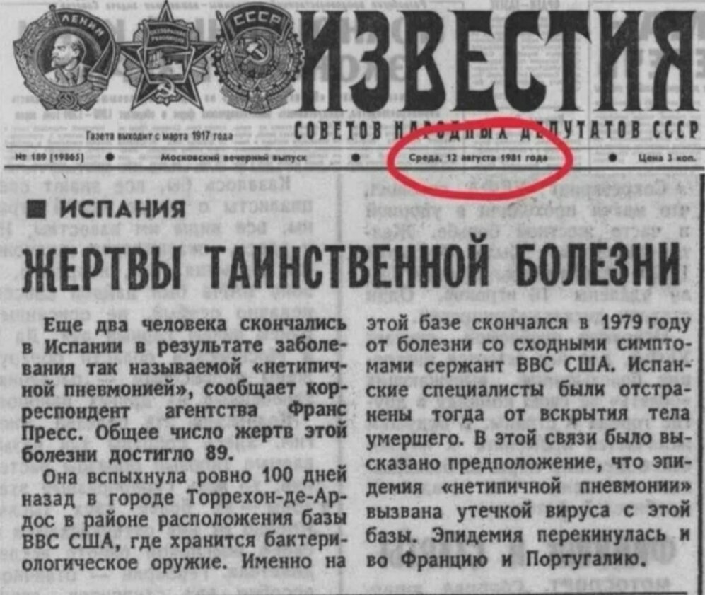 В 1981 году газета «Известия» опубликовала материал о «жертвах таинственной болезни». Эпицентром в тот раз, по всей видимости, была Испания. Издание сообщало о 89 погибших. Советские журналисты утверждали, что распространение вируса началось с американской авиабазы вблизи города Торрехон-де-Ардос.