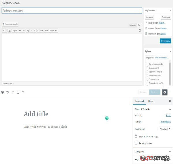 Обновив WordPress выше 5й версии, я офигел от нового редактора новостей, там такая каша, даже картинку вставить по нормальному не получается, не говоря уж о каком то коде. Мне WordPress нравился тем, что можно спокойно работать с кодами, как нужно можно отредактировать ссылки, картинки, текст и т.д., в новом же редакторе все корректируется по ихнему, даже в режиме кода, а мне это не нравится. Когда зашёл обновить плагины, на главной странице увидел Classic Editor, этот плагин как раз и возвращает старый добрый редактор. По идее меня такой расклад устраивает, не нравится новый редактор, ставим плагин Classic Editor и получаем старый, однако поддержка данного плагина будет всего до 2021 года (вроде). Надеюсь разработчики WordPress, либо сторонние авторы, будут поддерживать плагин со старым редактором, либо доведут до ума новый. Статья на моём сайте www.strserega.ru