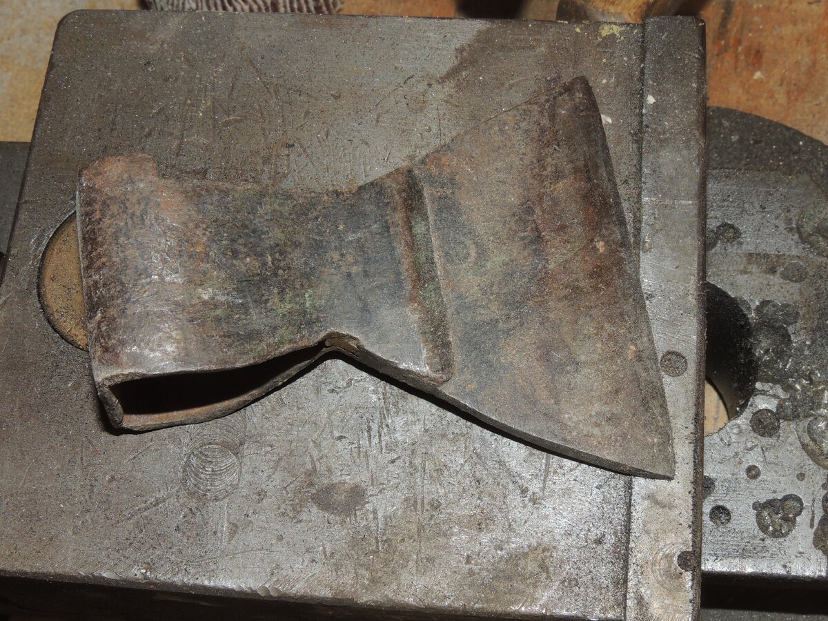 На даче в заначке деда жены нашел маленький плотницкий топор. По словам деда, топорик достался ему от отчима, что может означать, что сей девайс вполне мог быть изготовлен кустарно еще до революции (у них половина инструмента так сделана). Вещь добротная, но время сделало своё дело. Первым делом удалил рукоять, как ни странно - буковую (сильно рассохлась и дала трещину). Многие мастера при реставрации старого инструмента делают шедевры кузнечного и столярного ремесла - секиры, выполненные в скандинавском стиле, с глубокой гравировкой на топорище и резьбой на рукояти. Ничего такого не планирую, поскольку нужен рабочий инструмент, а не выставочный экспонат. Клинок почистил УШМ с лепестковым обдирочным диском с зернистостью Р40 снаружи, шарошками для бормашины - внутри. Угол заточки выбрал 20 градусов - для работы как с мягкими, так и с твердыми породами древесины. Предварительно плоскости задал той же УШМ. Главное - не перегревать металл, если нет желания связываться с термичкой. В проце