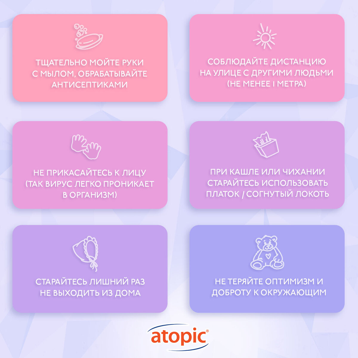 Дорогие наши подписчики! Ни для кого не секрет, что сейчас происходит во всем мире. Мы хотели бы вам напомнить о базовых вещах, которые помогут вам и вашим близким быть в безопасности. Но не стоит наводить панику. Ведь наш мозг - штука умная. Его необходимо подкреплять уверенными и позитивными мыслями. Позаботьтесь о себе с умом! С заботой о вас, atopic®