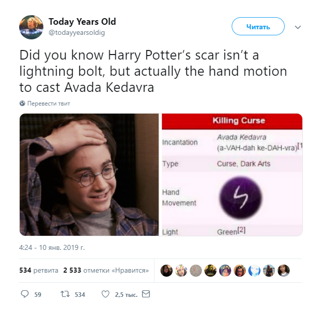 «А вы знали, что шрам Гарри Поттера — это не молния? На самом деле он повторяет движение руки, которое необходимо для «Авада Кедавры» В качестве доказательства юзер приводит скриншот из англоязычного портала Wikia, посвящённого вселенной Гарри Поттера, и утверждает, что шрам у «мальчика, который выжил» — это след от опасного заклинания, а вовсе не молния, как все думали. Открытие шокировало многих: «Я даже не поттероман, но всё равно удивился!», — написал один из комментаторов. Другие фанаты заспорили: «Наверное, и сама Джоан Роулинг об этом не знает». Нашлись и те, которые заявили, что давно знали тайну шрама, и это не новость. Самые дотошные отметили, что шрам не повторяет рисунок движения, а отражает его зеркально. Тогда один из пользователей выдвинул ещё более любопытную теорию: «Волан-де-Морт сделал неверное движение при заклятии, поэтому Гарри Поттер отделался только шрамом, а не умер!». А вы что думаете об этой истории?