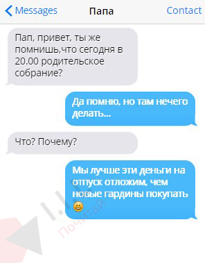 Знаете, есть такая фраза, то единственный мужчина, который вас будет любить просто так - это ваш отец. Конечно, это выражение подходит больше девочкам, но всё же. Не знаю как у кого, но на все школьные собрания, школьные мероприятия, спектакли ходил именно отец, именно его крепкое плечо помогало мне. Когда он был рядом казалось,что мне всё по плечу. Конечно как и все он в один прекрасный момент решил осваивать новые технологии и вот некоторые из СМС сообщений. А так, почему-то, отцы быстрее осваивают новые технологии.