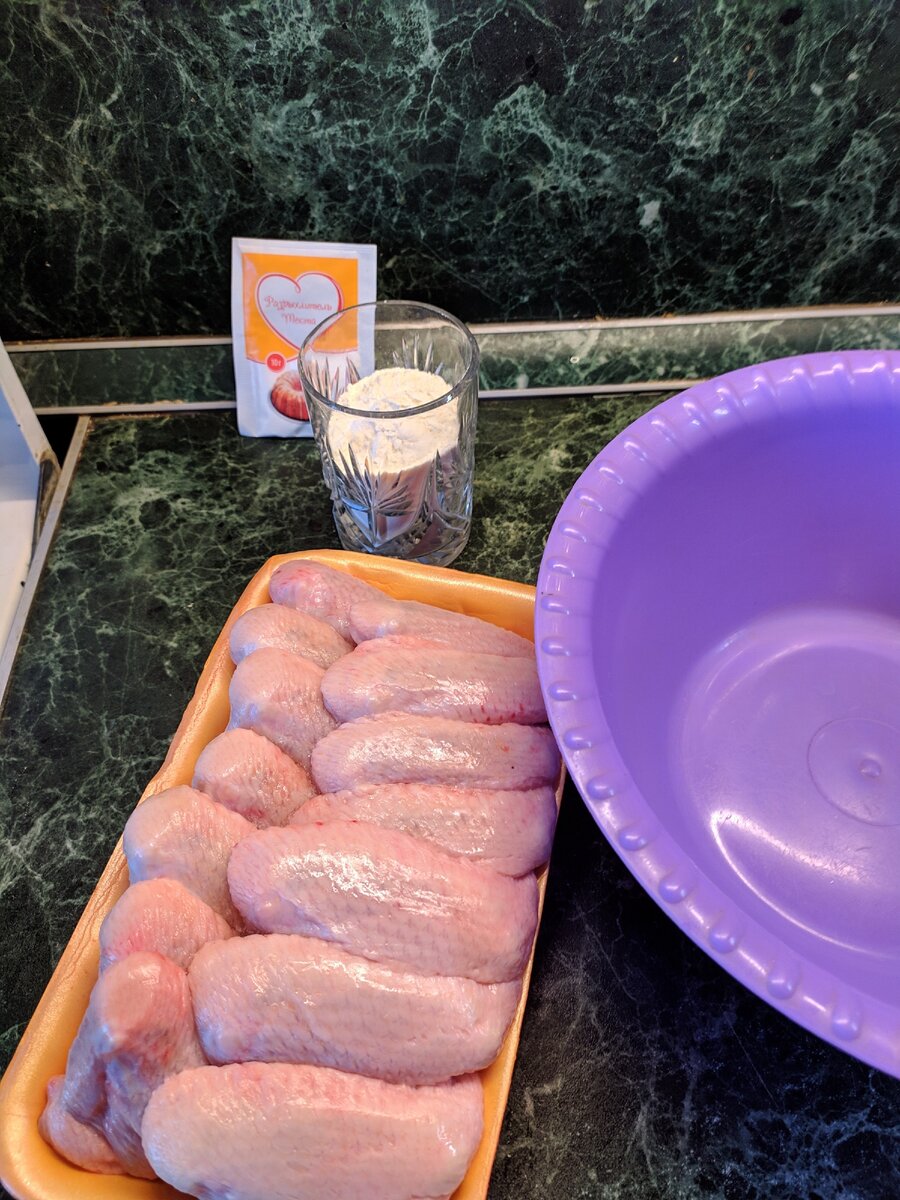 Ингредиенты Режем крылья - отрезаем кончики и режем пополам. Перемешиваем разрыхлитель с мукой и добавляем в мясо. Все тщательно перемешиваем.(не солим, соль дает специфику выделения влаги, поэтому чтобы получилась хрустящая корочка НЕ солим) Смазываем противень растительным маслом и выкладываем крылья. Смазываем немного растительным маслом сверху( без энтузиазма) Ставим в разогретую духовку минут на 40 пока не образуется корочка, переворачиваем,немного смазываем маслом и отправляем в духовку еще минут на 10-15. Пока готовятся наши крылья делаем соус Ингредиенты: Итак,все смешиваем, хорошенько перемешиваем. Пока готовили соус приготовились наши хрустящие крылья. Выкладываем в блюдо мясо и добавляем соус. Хорошо перемешиваем Дальше 2 варианта - 1. Можно подать в таком виде. 2. Выложить на противень обратно и еще минут на 5 -