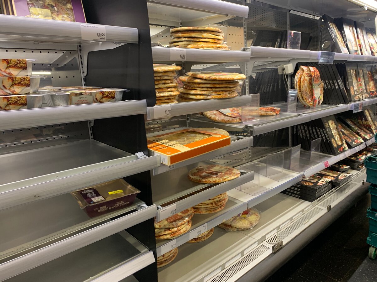 Ещё совсем недавно полки североирландских магазинов изобиловали разнообразием и огромным ассортиментов. Сейчас около половины товаров на акциях, с желтыми этикетками (это означает, что сегодня- крайних срок потребления по стандарту). Или же вообще пустые полки...с возможностью ли пополнения??