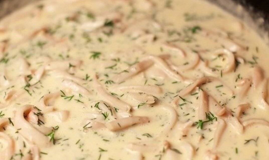 - 2. Небольшими горстями брать нарезанные кальмары и тушить на разогретой сковороде, одновременно посыпая солью, перцем и добавляя в каждую порцию по столовой ложке сметаны. Важно не передержать кальмары — каждую порцию стоит тушить по несколько секунд, пока они не побелеют.