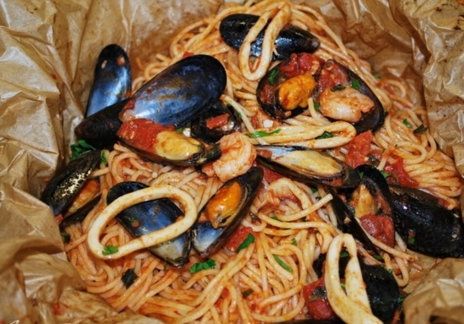 Ингридиенты Спагетти 200 г Помидоры консервированные в собственном соку 350 г Мидии в раковинах 200 г Креветки очищенны 200 г Кальмары вареные 200 г Чеснок 2 зубчика Оливковое масло 30 г Вино белое 30 г Соль по вкусу Перец чил 2 шт Петрушка зелень 1 пучок. Приготовление: Нагрейте масло в сковороде и обжарьте в нем чеснок и перец чили (я взяла сухой перчик чили). Добавьте к чесноку помидоры и влейте белое сухое вино, тушите пару минут.Кальмары нарежьте кольцами, мидии очистите ножом (если необходимо) от посторонних наростов. Мидии добавьте к соусу и закройте крышкой, варите все вместе в течение 5 минут, пока у них не раскроются раковины. Тем временем отварите спагетти в кипящей подсоленной воде до состояния альденте. Пока паста варится, к соусу с мидиями добавьте креве