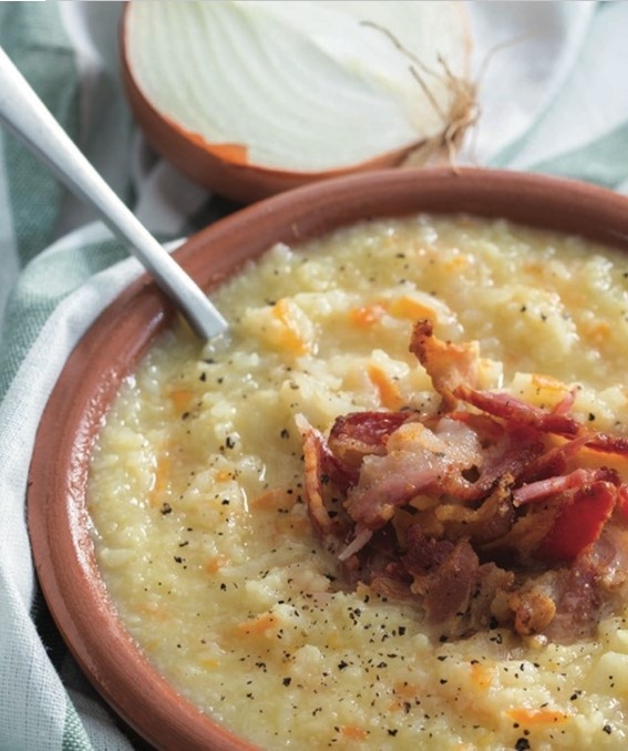 • цветная капуста • белый лук, нарезанный кубиками • 1 маленькая морковь, измельченная • 1–2 стакана сметаны • 16 ломтиков бекона 1. Нарежьте цветную капусту и добавьте в кастрюлю смазанную маслом, с луком и морковью. Приправить и варить, пока лук не станет прозрачным, а другие овощи не станут мягкими. 2. Добавить 4 стакана воды и довести до кипения. Снизить огонь после кипения в течение 1 часа, периодически помешивая. 3. В последние несколько минут смешайте сметану. 4. Обжарить полоски бекона до хрустящей корочки, нарезать их и добавить в каждую миску для супа при подаче.