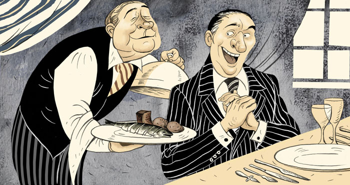 Пришел новый русский в ресторан пообедать. Накрыл "поляну", выпил, закусил-настроение поднялось Оглядывает зал, смотрит,семья интеллигентов сидит, едят супчик вегетарианский, чай пьют. Он подзывает сынка "ботаника" и говорит: Слышь,пацан! Садись угощайся-вот икорка,котлетки,жаркое,фрукты,сок себе наливай! Тут интеллигентная мамаша поворачивается к новому русскому и говорит: молодой человек, наш сын сыт! Новый русский: Так я и говорю,пусть не ссыт,а садится и кушает!
