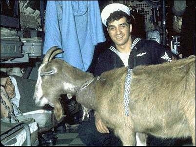 На лодке заряжалась батарея. Мы долго пытались спустить козу по трапу, а потом просто схватили её за рога и крикнув: "Полундра!", бросили вниз. Парни, игравшие там в карты, были здорово шокированы. Кеннет С.(Свинья ) Генри .