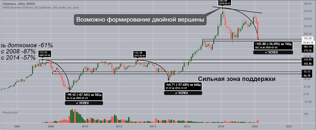 Я не ожидаю завершения падения в ближайшее время. Сейчас бумага упала всего на 36% с хая, однако в предыдущие кризисы она падала гораздо сильнее: