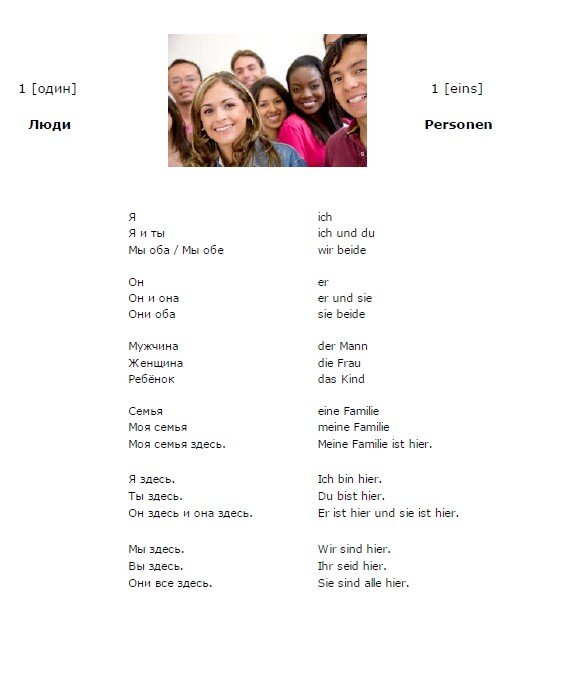 Английский язык. Урок 1. Добрый день! Переместимся с британских островов в центр Европы и начнем изучение еще одного германского языка - немецкого. После английского у меня в планах еще минимум 9 - 10 языков. Впрочем покажет время. Немецкий язык многие изучают, но не все могут на нем говорить. Рекомендую проходить по одному уроку в день. Главное правило. При изучении любого языка лучше несколько раз раз в день уделять по 3 - 5 минут, но регулярно и каждый, чем по несколько часов пару дней, а затем на полгода забросить все. Структура подачи материала следующая. Сначала рисунок, затем тектовая часть и в конце видео. Данная структура будет представлена для всех 100 уроков немецкого, а также других языков. Итак начнем. Немецкий язык. Урок 1. 1 (один) - 1 (eins) Люди - Personen я - ich я и ты - ich und du мы оба / мы обе - wir beide он - er он и она - er und sie они оба - sie beide мужчина - der Mann женщина - die Frau ребёнок - das Kind семья - eine Familie моя семья - meine Familie Моя се