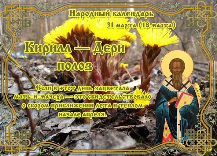 По церковному календарю этот день называют Кирилл – Дери полоз в честь святителя Кирилла Иерусалимского. К этому времени дороги становились совсем плохими для езды на санях, отсюда и такое название. Другое название этого дня – Иоанн Лествичник. В старину считалось, что домовой просыпается именно в последний день марта и начинает свои ночные проказы. Чтобы его задобрить, с вечера ставили в углу за веником блюдце с молоком или кашей. По приметам на этот день в старину судили о погоде на начало апреля. Если уже прилетели лебеди – скоро ожидалось тепло, если дым от костра клубится – погодные условия ухудшатся, если ворона свое гнездо высоко построила – ждали половодья. Также обращали внимание на оставшийся снег: если он гладкий – урожая не будет, если шершавый – ожидается урожайное лето. По народным поверьям в этот день нельзя давать в долг соль и хлеб, если в доме есть грудной ребенок (считалось, что так можно отдать его счастливую судьбу). Также нельзя занимать и давать деньги в долг (