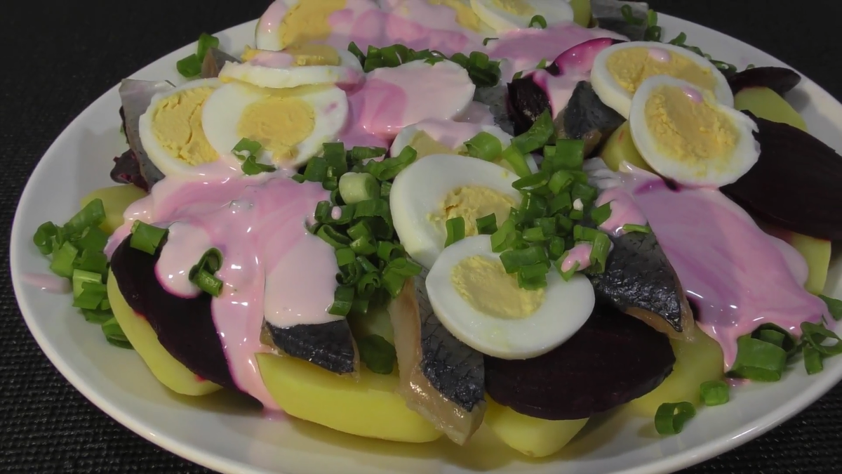 На блюдо выкладываю картофель, ломтики свеклы, селедку, и яйца. Произвольно, яркими островками, добавляю зеленый лук.