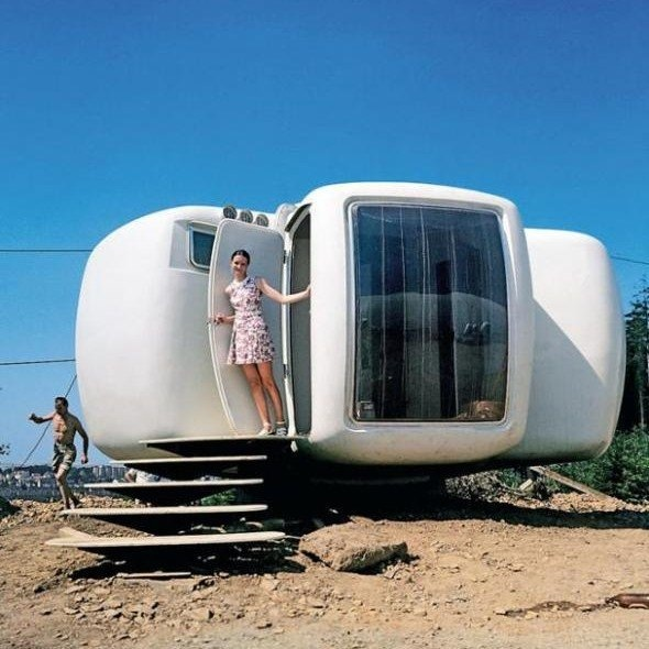 Французский архитектор Жан-Бенджамин Маневал в начале шестидесятых спроектировал дом из пластика «Maison Bulle». По этому проекту было создано около 300 домов, некоторые из которых существуют и сегодня. Как не странно в Советском союзе также появились объекты в стиле «Maison Bulle» В Ленинграде в 1961 году на Торжковской улице, среди хрущевских пятиэтажек был построен первый он же и последний дом из пластика. Дом был двухэтажным. На нижнем этаже находились различные коммуникации и установка воздушного отопления и вентиляции. Верхний этаж был изготовлен из пластмассы На нем располагалась довольно просторная квартира —49 кв.м. Состояла она из одной общей комнаты, небольшой кухни, совмещённого санузла и кладовки. Всю мебель внутри дома тоже изготовили из пластмассы. Выйдя через дверь, можно было попасть на собственную террасу. Кстати, позволить себе такую квартиру-дом могли бы многие советские граждане. Себестоимость её была около 850 рублей В Домбае туристическая гостиница дом «Футур