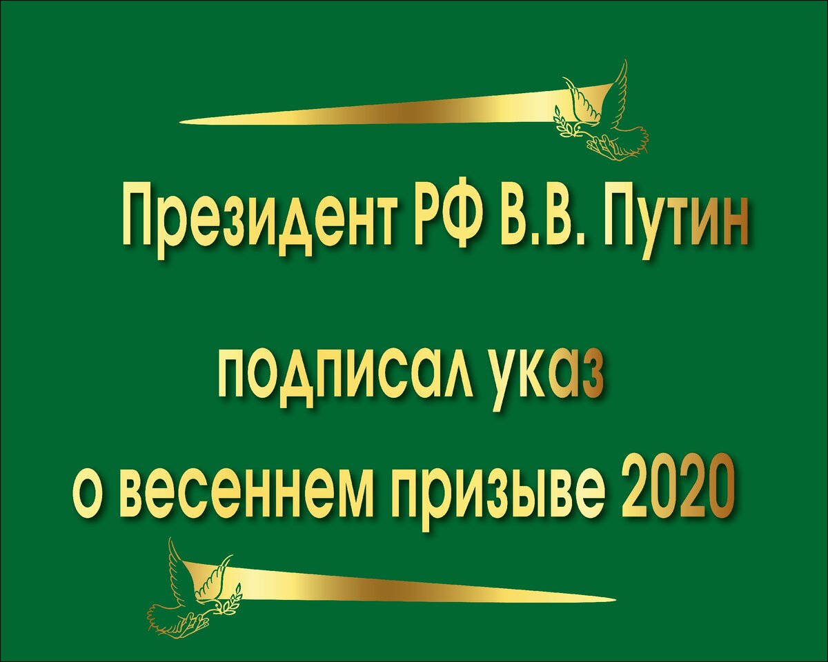 30 марта 2020 года Президент Российской Федерации В.В. Путин подписал Указ о призыве граждан РФ на военную службу в весенний призыв 2020 года. Согласно этого Указа призыв граждан для прохождения военной службы будет осуществляться с 01 апреля по 15 июля 2020 года, будет распространяться на граждан РФ в возрасте от 18 до 27 лет не пребывающих в запасе и подлежащих призыву на военную службу. Для прохождения военной службы будет призвано 135 тысяч граждан РФ. Так же , в соответствии с Указом от 30.03.2020 года, в эти же сроки будет проведено увольнение граждан, проходящих военную службу по призыву. Чуть ранее Министр Обороны РФ С. К. Шойгу заявил, что все новобранцы, прибывшие в войсковые части в ходе весеннего призыва 2020 будут проходить двухнедельный карантин. Основная масса призывников будет отправлена в войска в мае-июне. Наш сайт: KSMRUS.RU