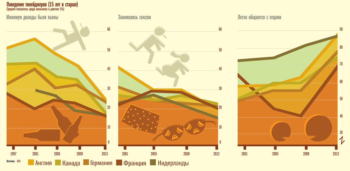 В этой постоянной рубрике мы исследуем современный мир с помощью цифр и картинок. Европейские взрослые умиленно наблюдают за своими чадами-подростками: у молодежи в тренде целомудрие и рациональность. Например, с 1997 по 2013 год количество 15-летних, которые минимум дважды (то есть на один раз больше, чем просто попробовали) пили алкоголь, уменьшилось вдвое. А занимавшихся всякими взрослыми вещами — в полтора раза. Зато вдвое увеличилось количество подростков, которые ответили, что им проще находить общий язык с родителями. Социологи объясняют это так: из-за социальных сетей у подростков теперь значительно больше знакомых, но меньше близких друзей. Тинейджерам стало намного сложнее замкнуться в узком круге, организоваться в субкультуру и объявить унылым предкам войну. Евгений Базаров посрамлен! ПО ТЕМЕ