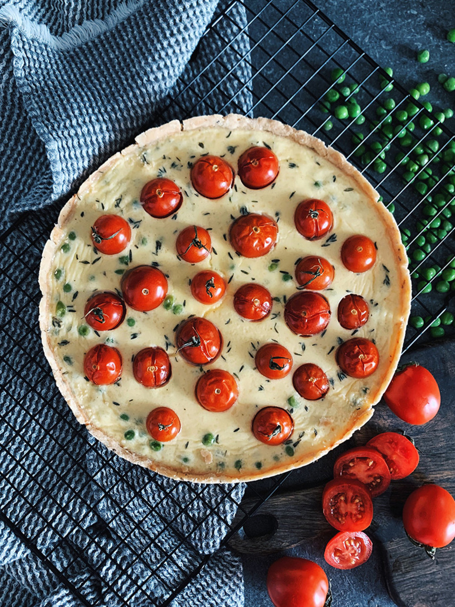 Ингредиенты: 1)сливочное масло - 100г 2)муки - 200г 3)яйцо - 1шт 4)1 ч.л. соли 5)зелёный горошек - 300г 6)помидоров - 250г 7)сметаны 10% - 250г 8)яйца - 3шт 9)щепотка сухих трав 10)соль и перец по вкусу. Приготовление: Насыпать муку и соль в емкость и перемешать. Натереть туда же масло. Растереть масло с сухими ингредиентами в крошку. Влить яйцо и рукой вмешать его в масляно-мучную смесь. В процессе тесто будет сбиваться в комки.Нам так и нужно. Подготовить форму. Если неразъемная и не силиконовая – смазать дно маслом и посыпать мукой. Пересыпать в форму комки теста и руками прижать их к стенкам и ко дну, формируя бортики примерно по 2,5 см. Поставить в морозилку примерно на 20 минут. В это время разогреть духовку до 190 градусов. Достать основу из морозилки, положить на нее бумагу для выпечки, сверху насыпать горох или рис, выпекать 10 минут. Затем достать форму из духовки, убрать бумагу и груз, вернуть основу в духовку и печь еще 10 минут. Подготовить начинку. Помидоры и перец помыт