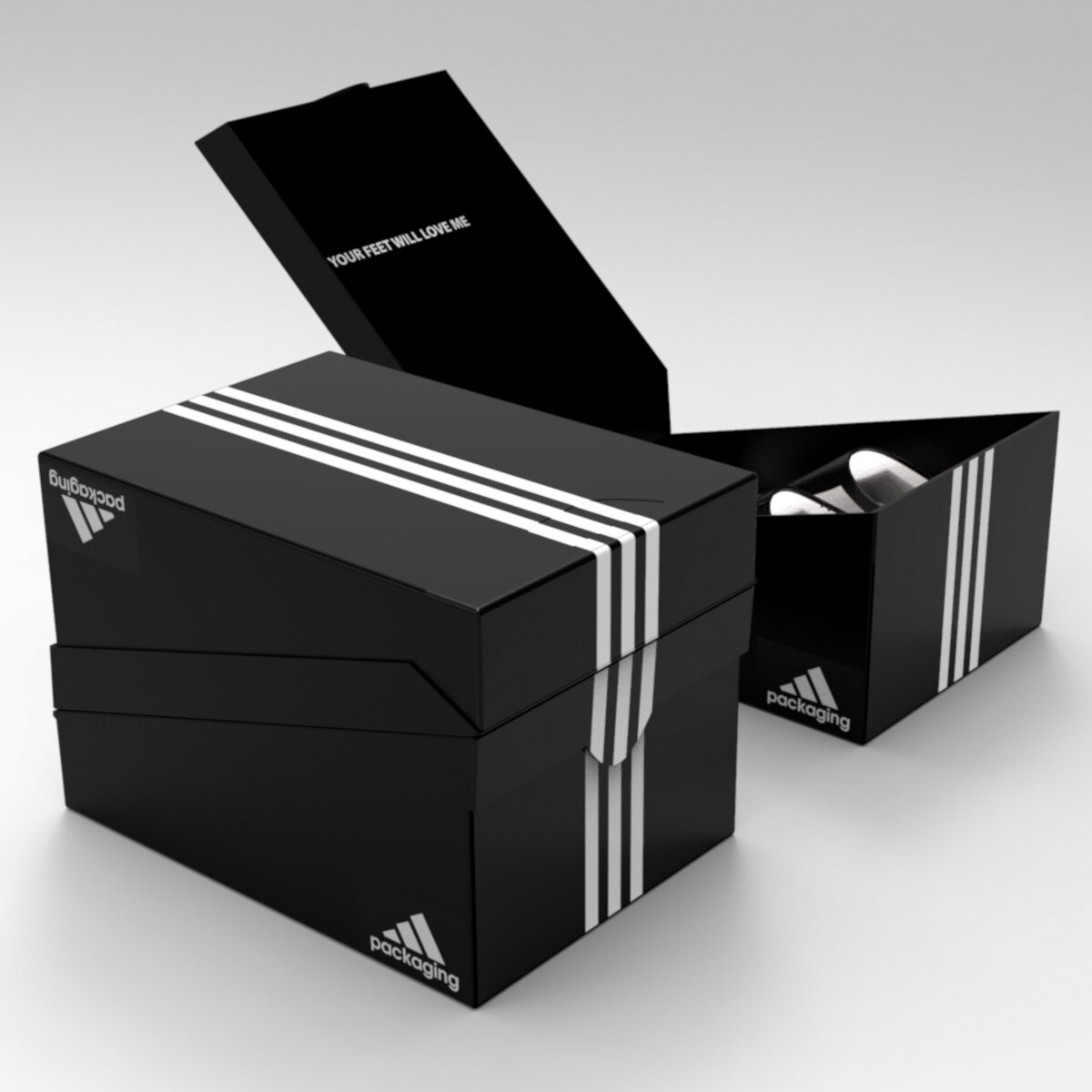 Индийский дизайнер Sanket Patel разработал конструкцию упаковочной коробки для спортивной обуви Adidas. Этот проект является частью его работы по упаковке в колледже, где надо было выбрать бренд и разработать более эффективную и устойчивую упаковку для их товаров. (Этот проект для аудитории, он не заказан ни одним брендом). За 3 года работы дизайнером обуви Sanket Patel получил возможность очень внимательно наблюдать и изучать отрасль. Он заметил, что упаковка, используемая для обуви не изменилась почти за век. Даже крупные бренды, такие как Adidas и Nike, используют одинаковые прямоугольные обувные коробки. Изготовление одной коробки отнимает много времени. Также они занимают много места при хранении. Sanket Patel решил вмешаться и найти более оптимальное решение. Sanket Patel выбрал Adidas в качестве бренда для своего упаковочного задания. Его дизайн – трапециевидная коробка с откидной крышкой и прорезной рукой (фигурное отверстие) для переноски. Полностью складная, экологически чис