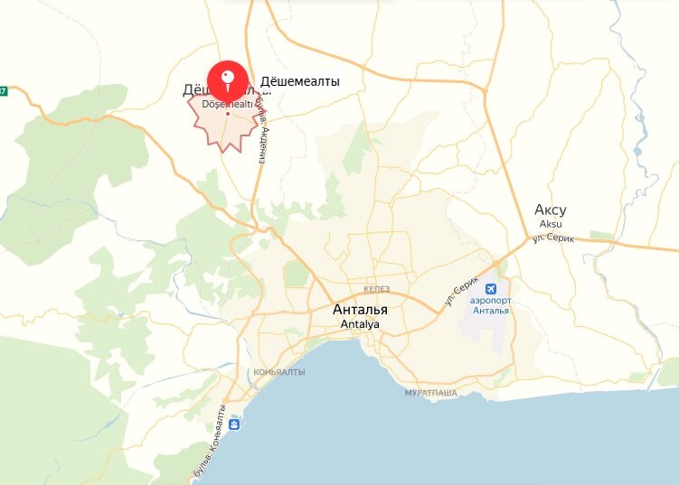 Анталия. Дёшемеалты Район расположен достаточно далеко от центра города и прибрежной полосы. Добраться туда можно по хорошей широкой трассе по направлению Бурдур-Анкара. Поворот по указателям ведет в Дёшемеалты. Общественного транспорта туда ходит не много. Район состоит в основном из вилл, как отдельно стоящих, так и в сите (комплексе). Здесь хорошие, красивые, новые сите. Расположены по обе стороны трассы. Ранее это был отдельный город, который впоследствии был присоединен к Анталии, стал ее районом. Здесь виллы и дома разного размера разбросаны по полям. Нет такого упорядоченного расположения, как в центральных районах Анталии. На одной из центральных улиц Дёшемеалты стоит большой торговый центр. Есть свой базар, рядом с ним расположен стадион. В районе свои школы и лицеи, но до них добираться порой далековато, потому что территория довольно растянутая. Продолжается активная застройка. Высокие дома соседствуют с небольшими виллами. Рядом с некоторыми частными домами есть свои са