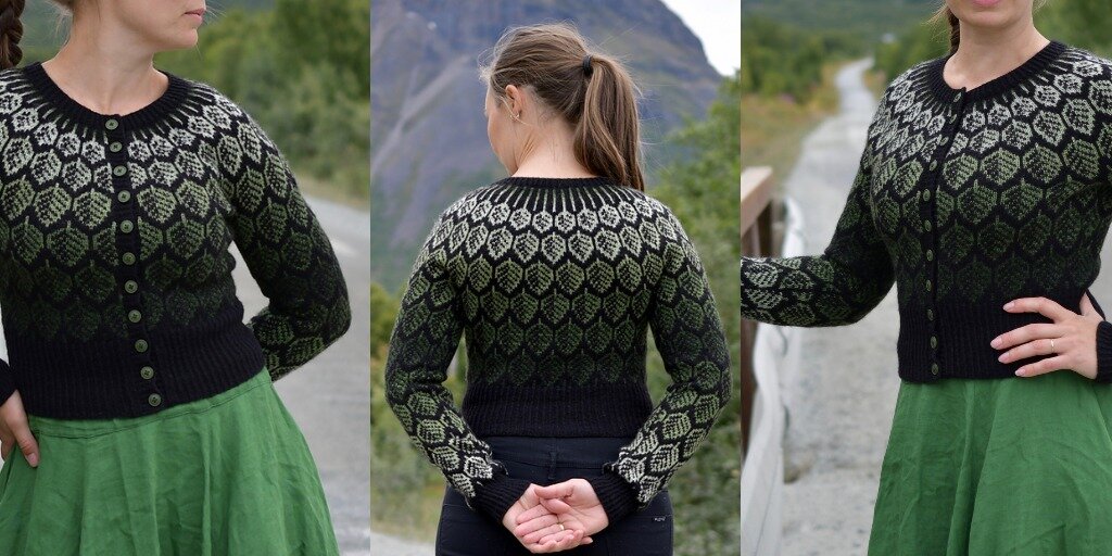 Красивый, укороченный жаккардовый кардиган с узором из листьев с градиентными оттенками цветов - очень необычная модель от норвежского дизайнера Lene Tøsti.