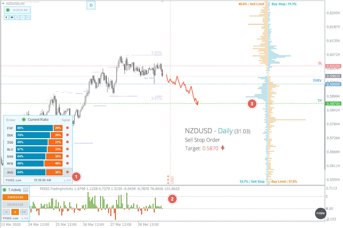 В данной публикации рассматриваем пару NZD/USD . Аналитика ведётся с позиции стратегии "Против толпы", главное правило данной стратегии понимать что делает большинство трейдеров и действовать в противоположную сторону, так как на рынке всегда работает принцип Парето: 80% прибыли имеют 20% трейдеров... крупных трейдеров... очень крупных трейдеров... я думаю вы поняли про кого я :) В прогнозах нам помогает пакет индикаторов "Стратегия против толпы" для МТ4. Бесплатные версии данных индикаторов во главе с одним из самых, на наш взгляд нетипичных индикаторов, который отображает объёмы и уровни цен, на которых расположены скопления чужих Stop Loss трейдеров Форекс доступны по ссылке тут. По данному прогнозу мы рекомендуем сделку на продажу с помощью отложенного ордера по цене - 0.595. В основе данной идеи лежит следующий анализ: