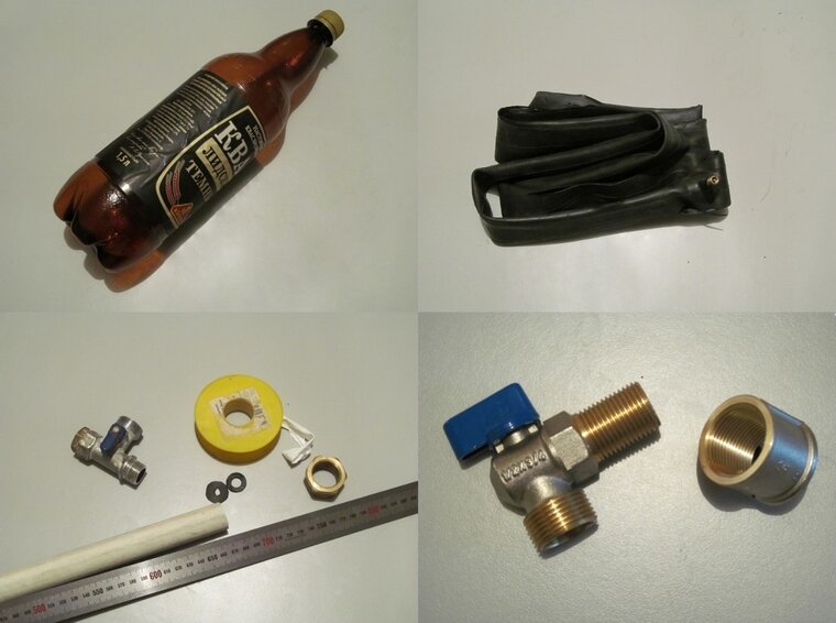 переходник сантехнический с краном (с ¾ дюйма на ½ дюйма), муфта соединительная (¾ дюйма), отрезок трубы металлопластиковой 70 см (диаметр ½ дюйма), лента уплотнительная.