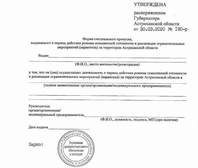 Об этом гласит распоряжение Правительства региона «О введении на территории Астраханской области ограничительных мероприятий». Согласно документу, Штаб по предупреждению завоза и распространения новой коронавирусной инфекции должен составить список организаций, работники которых должны быть обеспечены пропусками. Бланк пропуска также уже разработан. Так, с 31 марта на улице можно находиться только при наличии этого документа. Если вы не сможете предъявить спецпропуск сотрудникам полиции, будете наказаны в соответствии с Кодексом административных правонарушений.