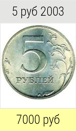 1. Монета 2003 года 5 рублей Её стоимость может превышать 7.000 тысяч рублей. 2. Монета 2003 года 2 рубля Её стоимость может превышать 13.000 тысяч рублей. 3. Монета 2014 года 50 копеек Её стоимость может превышать 30.000 тысяч рублей. 4. Монета 2001 года 2 рубля Её стоимость может превышать 50.000 тысяч рублей. 5. Монета 2001 года 50 копеек Её стоимость может превышать 100.000 тысяч рублей. 6. Монета 2011 года 10 рублей Её стоимость может превышать 120.000 тысяч рублей.