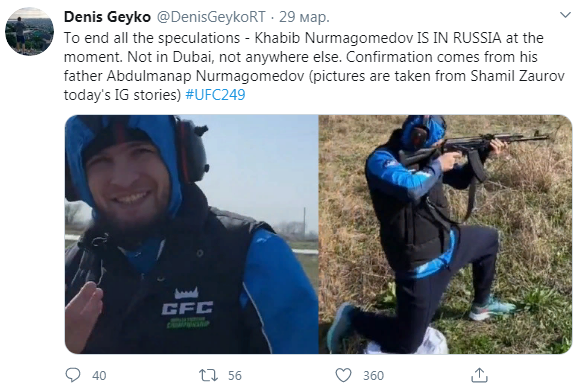 Приветствую Вас на своем канале, дорогие подписчики! UFC 249, пожалуй, единственное спортивное мероприятие, которое до последнего оставляло надежду на проведение. Но как бы не старался Дана Уайт, но коронавирус, хоть и косвенно, внес свои коррективы. 29 числа в сети появилась информация, якобы от отца Хабиба, который сообщал, что чемпион на данный момент находится в Дагестане. Правда менеджер борца поспешил данные новости опровергнуть. Если же это правда, то над поединком стоит большой знак вопроса. Потому что с 1 апреля Россия закрывает свои границы, и возможности выехать из страны у Хабиба не будет. Но уже вчера Нурмагомедов решил поставить все точки над "И", рассказав о ситуации на своей официальной странице в инстаграмме. О штатах Как и сообщалось ранее Хабиб готовился к поединку в клубе "АКА" порядка 10 дней. В последствии от Даны начала поступать информация, что в США бой точно проводить не будут. И очень возможным вариантом рассматривалось проведение в Эмиратах. После обсужде