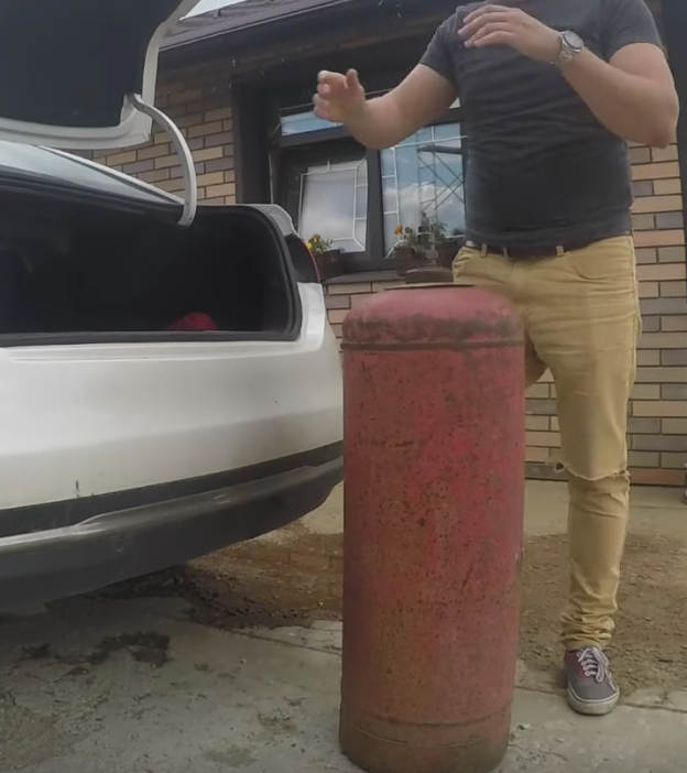Но увы у меня ничего не получилось, кран не поддавался. Дальше я решил отпилить кран, но прекрасно понимаю что пилить ушм его опасно, даже не смотря на то что газ выпущен и кран открыт. Так все равно может остаться немного... И рисковать, да ну его) И я взял обычную ножовку по металлу и отпилил кран. Честно сказать мучился я около часа. Шаг 3. Далее мы заливаем баллон под завязку водой. И оставляем на сутки. Береженного как говорится бог бережет! Шаг 4. Спустя сутки сливаем воду, главное подальше от людей. Одорант который добавляют в газ очень воняет. И