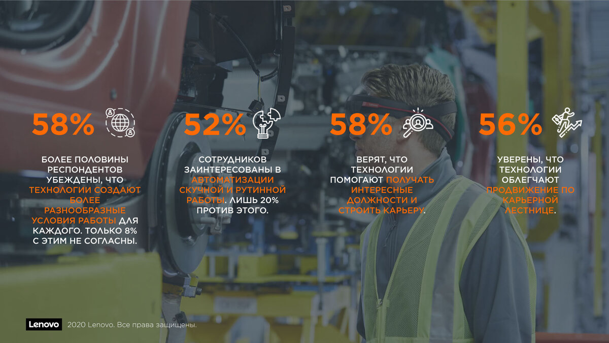 Минск, 25 марта 2020 г. — Компания Lenovo провела исследование о роли технологий в рабочем пространстве. Более половины опрошенных (58%) убеждены, что технологии помогают разнообразить условия работы и облегчают карьерный рост. Еще 52% респондентов заинтересованы в автоматизации скучной и рутинной работы. "Технологические устройства существенно влияют на современное рабочее место и предоставляют немало преимуществ: от мгновенных разговоров тет-а-тет с коллегами во всем мире до упрощения и автоматизации изнурительных задач. В будущем технологии продолжат трансформировать рабочее пространство, чтобы оно становилось еще более интересным и продуктивным", ㅡ комментирует Боб О'Доннелл (Bob O'Donnell), президент и главный аналитик TECHnalysis Research. Исследование охватило более 15 тыс. человек со всего мира: США, Мексики, Бразилии, Китая, Индии, Японии, Великобритании, Германии, Франции и Италии. Более половины респондентов (51%) обеспокоены, что новые технологии могут ликвидировать их р