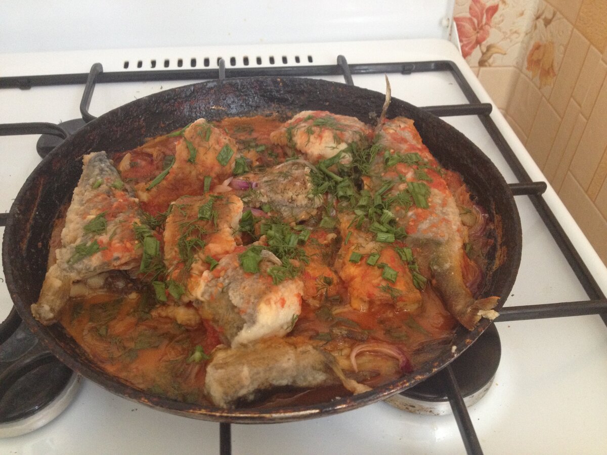 Статья на портале РНарод После удачного завершения рыбалки в пятницу, мы возвращаемся домой, а именно в гости к деду и бабе. По приезду ближе к вечеру около 16: 30, решаем все нерешённые дела, которые остались невыполненными, как говорится: " Не откладывай на завтра, что можно сделать сегодня". Пользуясь данным принципом пока ещё не стемнело я помогаю вскопать огород, покормить дом. хозяйство, и уже начинает темнеть. А теперь приступаем к подготовке рыбы. Для начала очищаем рыбу от чешуи, убираем внутренности, хорошенько промываем её. Ставим сковородку на огонь, добавляем растительное масло, рыбу обвалакиваем в муку и кладём на сковороду. А рыба, которая идёт на тушение, это щука и окунь, вобщем хищник. Пока рыба у нас обжаривается нарезаем репчатый лук, не сильно мельчив при нарезке, желательно чтобы он был нарезан кольцами и распределяем его на сковороде. Затем берём томатную пасту, если она сильно густая разбавляем её в воде, но пропорции должны быть такими, половина стакана том