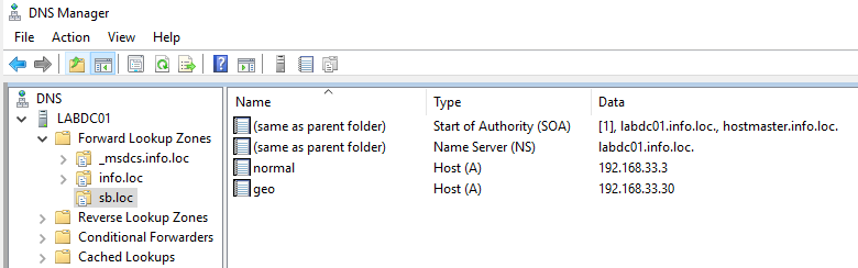 Задача #1: Имеется DNS-сервер на базе Windows Server 2016. На DNS-сервере настроена А-запись, которая разрешается всеми клиентами DNS, но есть группа клиентов в определенной подсети, которым нужно выдавать другое значение. Как это сделать? Дано: Пусть у нас имеется зона sb.loc, в ней имеется A-запись geo, она разрешается в адрес 192.168.33.30. Но есть клиенты в подсети 10.10.145.0/24, которые должны при запросе geo получить адрес 10.10.145.1. Решение: Необходимо настроить DNS policies. Для этого: 1) Создать подсети для клиентов из 10.10.145.0/24 Add-DnsServerClientSubnet -Name 'Subnet145' -IPv4Subnet '10.10.145.0/24' 2) Создать области (в ZoneName указываем имя DNS зоны на сервере, в которой А-запись) Add-DnsServerZoneScope -ZoneName 'sb.loc' -Name 'Scope145' Посмотреть, текущие области можно командой Get-DnsServerZoneScope -ZoneName 'sb.loc' Мы видим область, которую только что создана Scope145 и область по умолчанию sb.loc. Область sb.loc это та область, что мы видим в оснастк