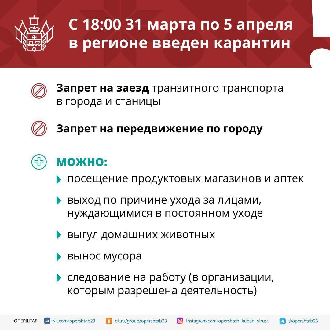 Внимание! С 18:00 31 марта по 5 апреля в Краснодарском крае введен карантин!