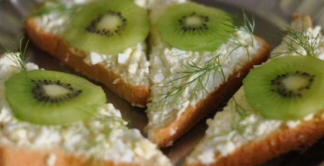 Бутерброды с киви и чесноком - это необычное блюдо с неожиданным сочетанием продуктов, с помощью которого можно удивить гостей и разнообразить как повседневное, так и праздничное меню. Вкусные, яркие и хрустящие бутерброды просто и быстро готовятся, привлекают к себе внимание и быстро разлетаются с тарелки! Время приготовления: 20 минут Кол-во порций: 10 шт. Ингредиенты: Приготовление: 1. Необходимо нарезать багет или батон ломтиками средней толщины (1см), слегка обжарить в растительном масле (чтобы бутерброды получились пожирнее) или подсушить на сковороде с двух сторон. 2. Очистить киви от кожуры и нарезать тонкими кружочками. 3. Майонез смешать с пропущенным через пресс чесноком, немного соли и перца (при желании на этом этапе майонез предварительно смешивается со сметаной, плавленным сыром (натёртым на тёрке) в равных пропорциях). Тщательно перемешать. 4. Намазать багет соусом, сверху выложить кусочки киви. 5. Накрыть бутерброды пищевой плёнкой и убрать в холодильник на 30 минут,