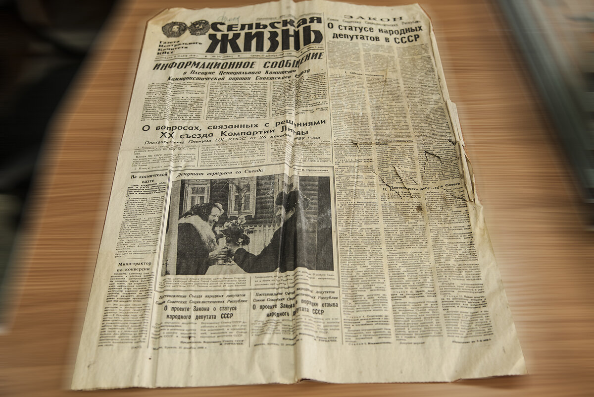 В нижней части полосы публикуется фотография под названием «Депутат вернулся со съезда». Улыбающаяся пожилая женщина принимает букет роз от мужа. Снимок выглядит постановочным, но только по части сюжета – эмоции искренние. Подпись под снимком гласит: «Мастер машинного доения колхоза имени Ленина Спасского района Рязанской области Герой Социалистического Труда Раиса Ивановна Секачева вернулась домой со второго Съезда наводных депутатов СССР. Первым ее встретил муж Василий Трофимович, который тоже трудится дояром. О работе Съезда и какие на нем решались вопросы депутат непременно расскажет при встречах односельчанам».