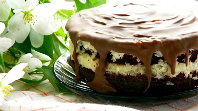 Как быстро и вкусно приготовить торт «Баунти» в домашних условиях. Подробный пошаговый рецепт с фото расскажет как приготовить эту красоту. Когда хочется порадовать близких вкусным домашним тортиком, но нет времени и желания возиться с духовкой, на помощь приходят рецепты десертов без выпечки. Всем любителям кокосовых десертов мы рекомендуем приготовить торт "Баунти" без выпечки, пошаговый рецепт с фото в домашних условиях Вы найдете ниже. Он отлично подойдет как для праздничного стола, так и просто для семейного чаепития. Ингредиенты: для основы: ВАЖНО! Печенье для этого рецепта лучше использовать классическое, без добавок. для кокосового крема: для шоколадной глазури: Смотрите также: Безумно вкусный морковный торт от Юлии Высоцкой Пошаговое приготовление: Шаг 1. Измельчить печенье в крошку и залить теплым молоком. Шаг 2. Добавить растопленное сливочное масло, сахар и какао-порошок. Шаг 3. Тщательно перемешать все ингредиенты до получения однородной массы. Шаг 4. Выложить поло