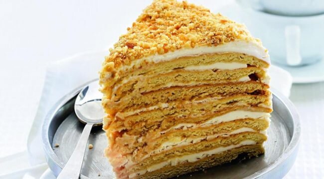 Как быстро и вкусно приготовить торт «Медовик» со сметанным кремом. Подробный пошаговый рецепт с фото расскажет как приготовить эту вкуснятину. Сегодня мы узнаем пошаговый рецепт с фото торта «Осенний» со сметанным кремом и медом. По другому такой десерт называют «медовик». Он тает во рту, и для этого не нужно использовать какие – то особенные ингредиенты. Приготовив такой десерт своей семье, он безусловно станет любимым блюдом. В описании рецепта довольно много шагов приготовления, но не стоит этого пугаться. Действия приготовления достаточно легкие. Ингредиенты: Смотрите также: Торт «Машенька» со сгущенкой и сметаной Пошаговое приготовление: Шаг 1. В первую очередь нам необходимо довести до кипения 2 столовые ложки меда. Для этого ставим на огонь с высокими бортами кастрюлю, помещаем туда мед и помешиваем, пока мед не закипит. Шаг 2. Далее к кипящему меду добавляем соду, воду и соль. Тщательно перемешивать, не убирая с огня. И в конце добавить 1 стакан сахара, мешать до того момен