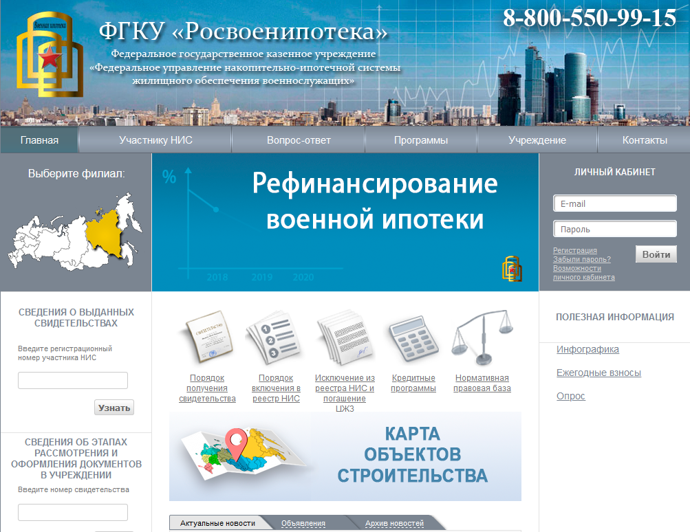 Обновления и полезные новости расположены на главной странице сайта. Также на главной странице военнослужащие могут воспользоваться сервисам для проверки статуса оформления свидетельства на право покупки жилья и статуса проверки документов при непосредственном проведении сделки участником системы.