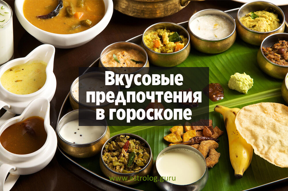 Существует довольно простой метод определения того, какая пища больше нравится человеку по его натальной карте. Предпочтения человека в еде следует рассматривать по второму дому гороскопа. Всего в аюрведической науке выделяется шесть вкусов, каждый из которых связан с определённой планетой. Так по нахождению той или иной планеты во втором доме, а также по аспектам планет на него мы можем определить какие вкусы человеку больше нравятся. Солнце – это горький вкус, Луна – солёный, Марс – острый, Меркурий – смешанный, Юпитер – сладкий вкус (также отвечает за жир в теле, поэтому Юпитер, связанный со вторым домом может дать проблемы с лишним весом, особенно в свой период), Венера – кислый и кисло-сладкий вкус, Сатурн – вяжущий (например, банан, гранат или хурма). Раху во втором доме даёт склонность к нездоровой и искусственной пище, а Кету указывает на то, что человек не привязан к еде, какие-то ограничения в питании. Современная диетология как правило не учитывает индивидуальные особеннос
