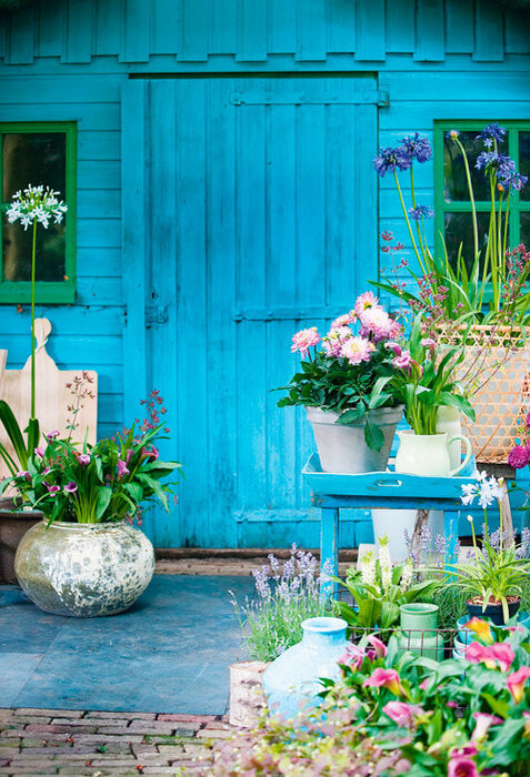 Если на территории участка еще не закончено строительство или планируется переделка дома, лучше повременить с основательным обустройством цветника и ограничиться посадками цветов в контейнеры. Контейнеры всегда можно перенести с одного места на другое, и при этом даже во время строительства участок будет выглядеть ярко и нарядно. Контейнерное озеленение подойдет и для тех, кто окончательно не выбрал место для устройства клумбы или заранее не подготовил землю. Самыми подходящими для контейнерного озеленения будут однолетние, продолжительно цветущие растения (петуния, сурфиния, пеларгония). В качестве контейнеров подойдут емкости с дренажным отверстием (не меньше 30 см высотой, шириной 20−30 см). Хорошо, если их внешний вид будет гармонировать с обликом дома.