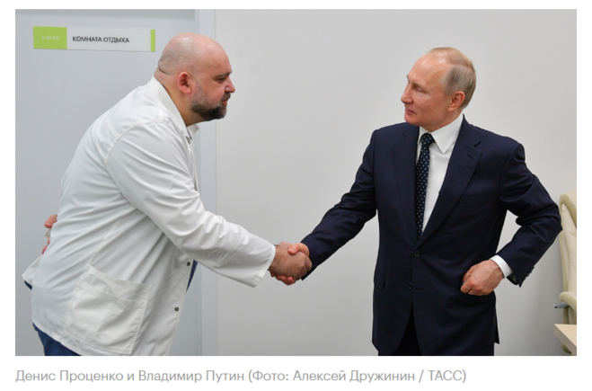 Семь дней назад Путин – без всяких средств защиты – находился в сравнительно тесном контакте с Проценко: пожал ему руку, сфотографировался с ним, прошелся вместе с Проценко и провел совещание, во время которого находился за одним столом с главврачом в небольшом замкнутом пространстве. Сам медик подтвердил в соцсетях свой диагноз. Он написал, что изолировался в своем кабинете и думает, что «выработанный за этот месяц иммунитет делает свое дело». На прошлой неделе Путин приезжал в Коммунарку и лично общался с главным врачом Проценко. Тот провел ему экскурсию по больнице, а при встрече пожал руку. После появления информации о положительном тесте на коронавирус у Проценко, пресс-секретарь Путина Дмитрий Песков заявил, что президент РФ тестируется на коронавирус регулярно, у него все нормально. Но, сам факт того, что, скорее всего, сам Денис Проценко уже был инфицирован, говорит о том, что велика вероятность того, что Путин мог подхватить коронавирус в эту встречу. Ведь человек,будучи в