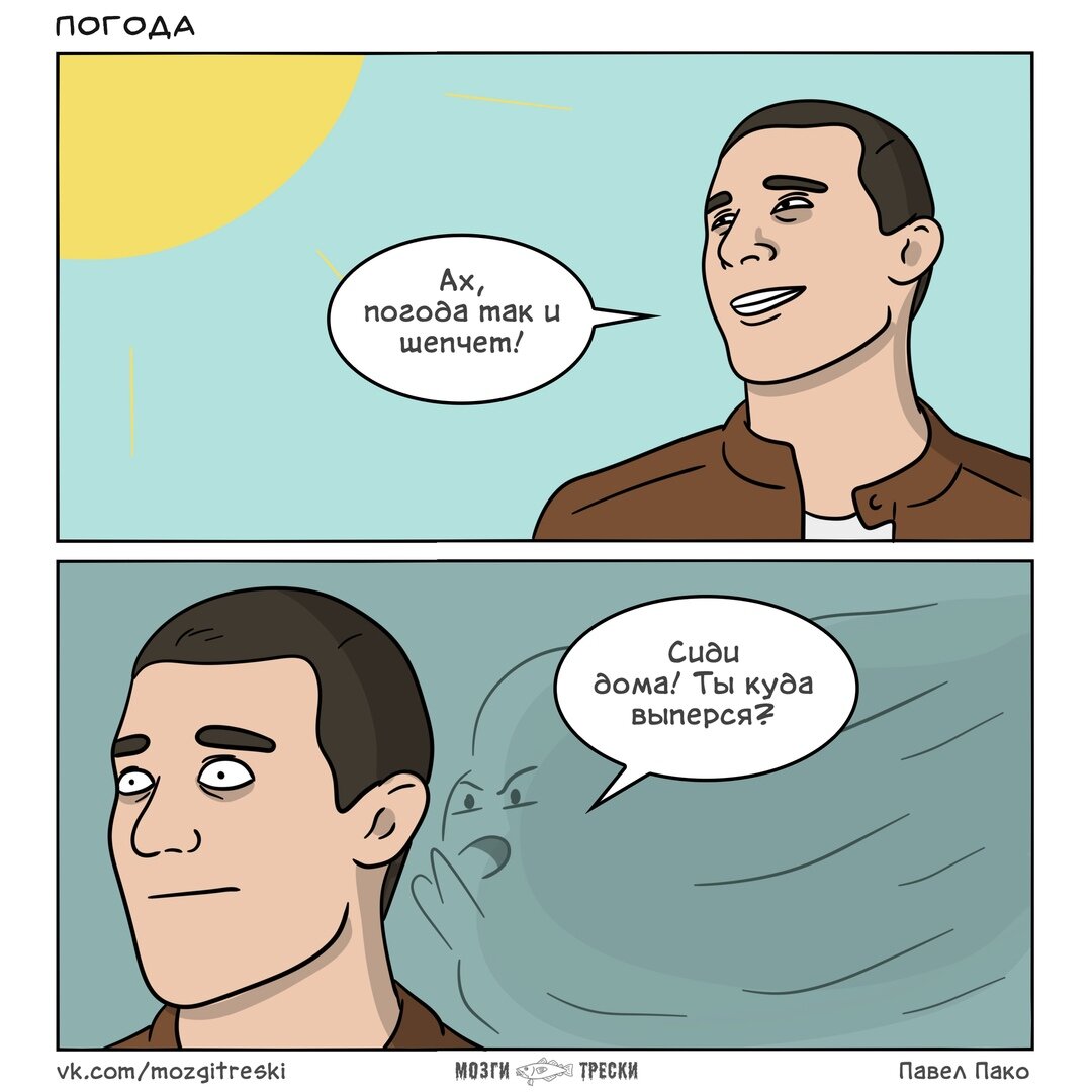 Павел Пако из Мозги трески нарисовал комикс о погоде. И о том, что она может подсказать тебе что делать. Правда, такое бывает не часто. В целом, ситуация, в которой ты будешь спрашивать совета у погоды, маловероятна.
