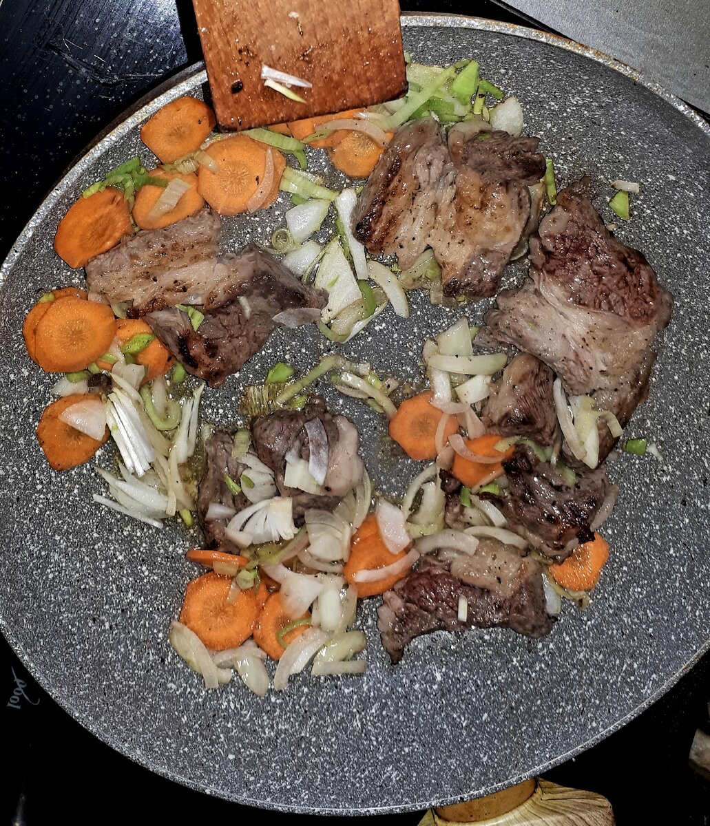 Гречку все закупили, а рецептов из гречки мало кто знает много, в основном готовят кашу гречневую, гречку отварную, гречку с жаренными овощами, суп гречневый, ну и, пожалуй, все. Я в магазин сейчас стараюсь не выходить, начала готовить, из того, что в морозильнике нахожу. На этот раз вытащила пакет с мясом, открываю, а там грудинка говяжья с прослойками жира. Сразу подумала о новом рецепте для всех, кто на карантине. Решила приготовить гречку с грудинкой, получится вкусно и питательно. На сковородке начала жарить лук, добавила кружочками морковь, а на половину сковородки положила мясо. Далее хорошо перемешала и жарила дальше. В это же время замочила грибы сушеные. Мясо с овощами прожарилось, самое время кидать грибы Добавляем грибы и жарим еще 10 минут. Добавляю гречневую крупу, добавляю соль, приправы, немного жарю все это вместе и добавляю воды. Воду добавляю ту, что осталась после замачивания грибов, если ее недостаточно будет еще обычную. Пробуем на вкус, как закипит переключаем на