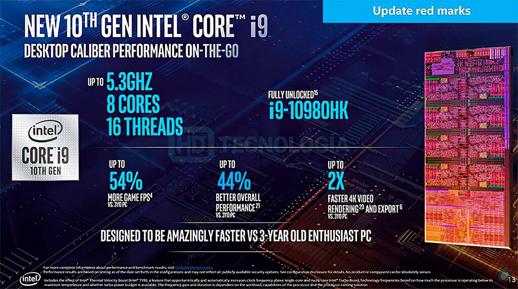 Как уже сообщалось ранее, официальный дебют мобильных процессоров Comet Lake-H (Core 10th Gen) состоится уже послезавтра – 2 апреля. Но некоторые «железячные» ресурсы не любят придерживаться договора о неразглашении. За пару дней до релиза ресурс HD Tecnologia «слил» в Сеть официальные слайды презентации, попутно раскрыв все технические параметры и состав линейки. В серию входят суммарно 6 моделей с количеством ядер от 4 до 8, все с поддержкой многопоточности, и все с 45-ваттным уровнем TDP. Техпроцесс – пресловутые 14 нм с уже неизвестно каким количеством +. Относительно предшествующих Coffee Lake-H Refresh изменения произошли минорные – на сотню-другую подросли частоты работы. Но некие оптимизации на уровне архитектуры могут сказаться на тепловыделении, а значит высокие частоты будут удерживать дольше. Также немного улучшился интегрированный контроллер памяти. Теперь он поддерживает до 128 ГБ памяти с режимом работы DDR4-2933. Появился “частично интегрированный” контроллер беспровод